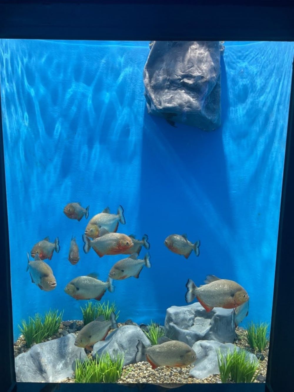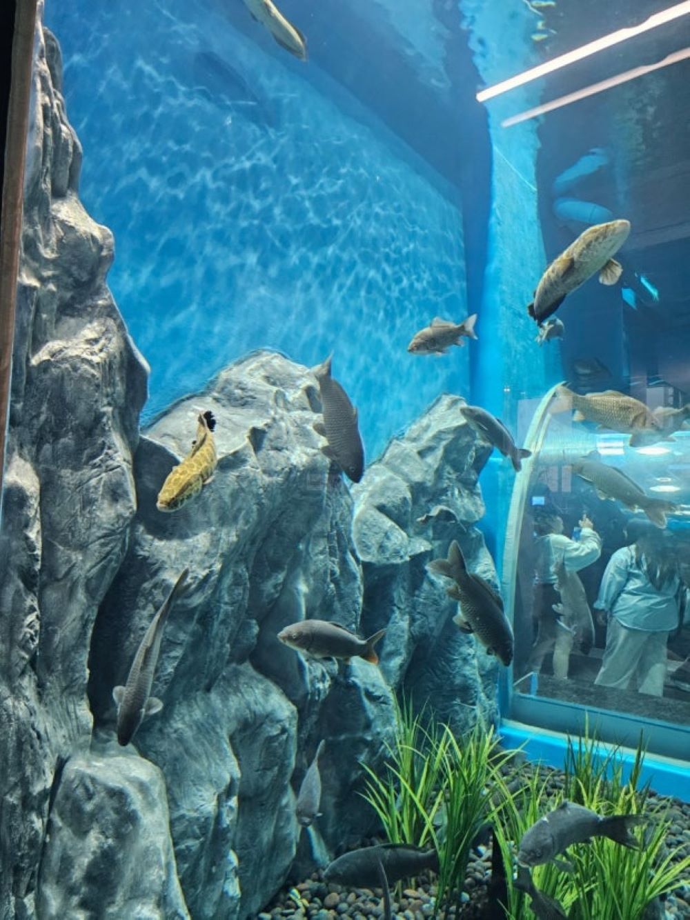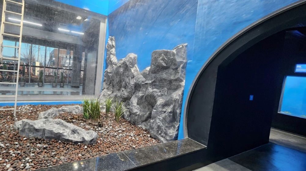 FRP로 인조암작업하여 물속에서도 견딜수 있게 처리하였으며 물고기들과 어울릴수